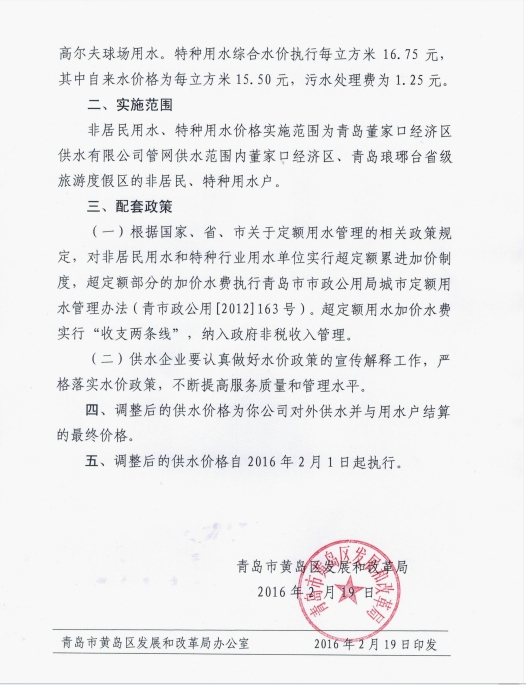 青島市黃島區(qū)發(fā)展和改革局關(guān)于青島董家口經(jīng)濟(jì)區(qū)供水有限公司供水價(jià)格的批復(fù)
